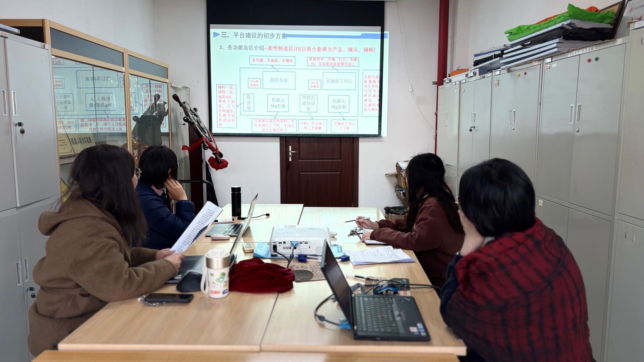 12月5日机器人专业教师们举行了课程建设与教学改革推进会。推进会围绕“出教材、细毕设、融平台、备新课”四项任务展开。第一,出教材。借鉴11月6日“持续完善教案”精神,本次明确“人人可主编”:教师先对照自己主讲的课程章节,提炼原创案例与实验。每位教师思考是否能结合自己的课程出教材、实践指导书,可从编写特点、任务分工、目录开始着手准备。第二,细毕设。在原任务书进行细化,补充软件程序说明书、硬件选型指导书、程序流程图模板、二维/三维图纸要求等内容,确保毕设内容。第三,融平台。探讨大平台建设融合思路,将课程建设与大平台建设同步开展,讨论在大平台建设方面可支持的教师教科研及学生比赛内容。第四,备新课。面对24版培养方案新增的选修课,要求任课教师先用“章节—知识点—实践”矩阵表厘清前后续逻辑,再制定完整的课程大纲、实践大纲,包括有哪些章节来支撑课程的核心内容,梳理前后续章节的连贯性与逻辑性。