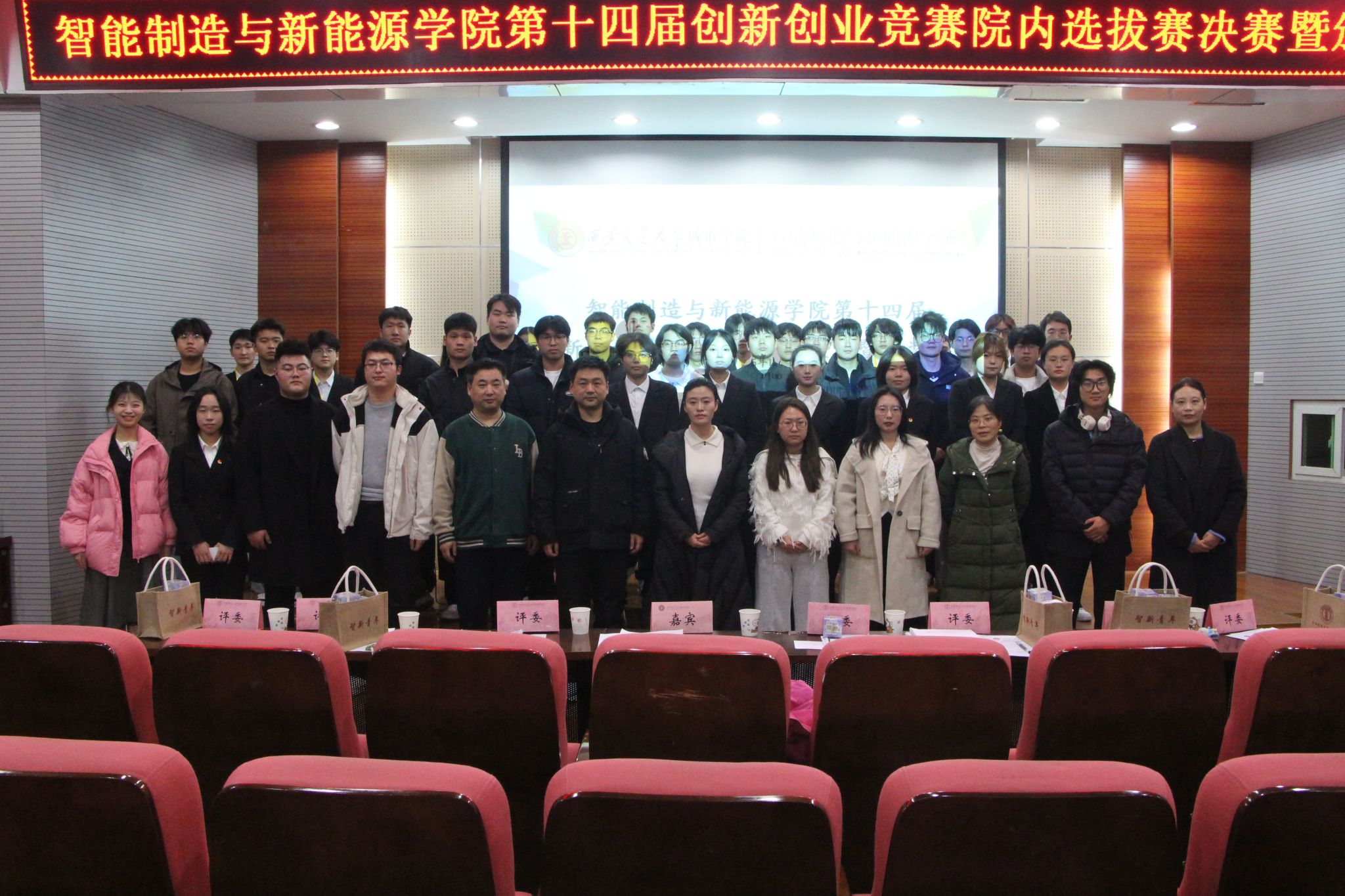 本次大赛邀请到了来自校内外、跨学科的专家与教师组成评审团,确保评审工作的专业性、权威性与公正性。受邀出席并担任评委及嘉宾的有:陕西省创新创业专委会资深创新创业导师李紫钰,校团委代表高荣,通识教育学院数学专业教师韩莹莹,机械电子系主任樊琛教授,智能制造与新能源学院实验室主任赵云芳,学院专业教师贾谦、刘兆梅、王月天,学生工作负责人王丽丽以及学院各年级辅导员。