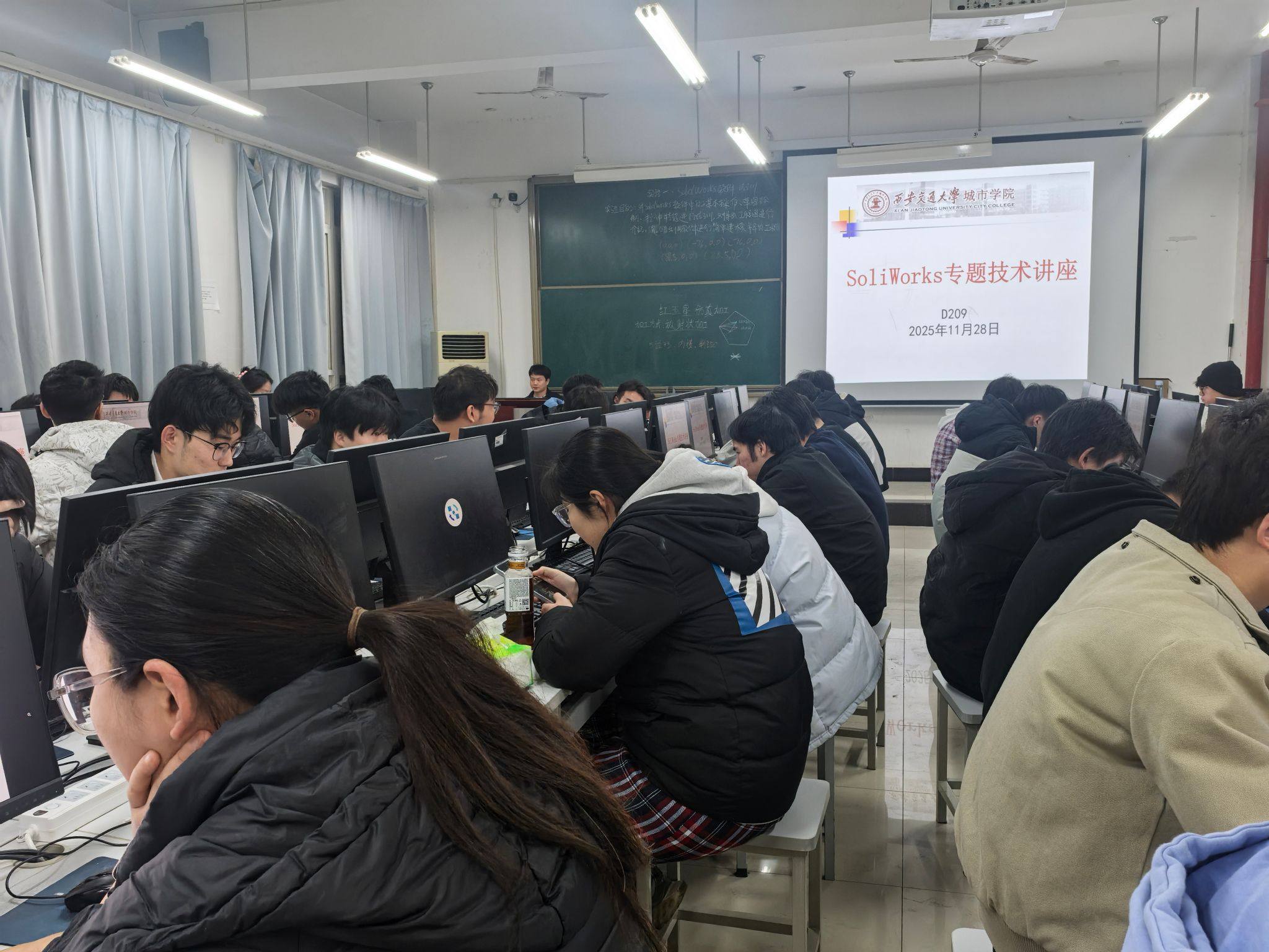 为进一步提升学生工程设计实践能力,夯实专业技术基础,助力学科竞赛与未来职业发展,11月28日晚,智能制造与新能源学院在教学楼D209教室成功举办SolidWorks建模高阶强化专题讲座。本次讲座聚焦行业前沿技术,特邀拥有多年工程设计经验与SolidWorks认证专家资质的讲师主讲,吸引了机械设计制造及其自动化、能源与动力工程、机器人工程等相关专业百余名师生到场参与,现场交流氛围浓厚。本次活动由成图大赛负责人尚雪梅老师主持。