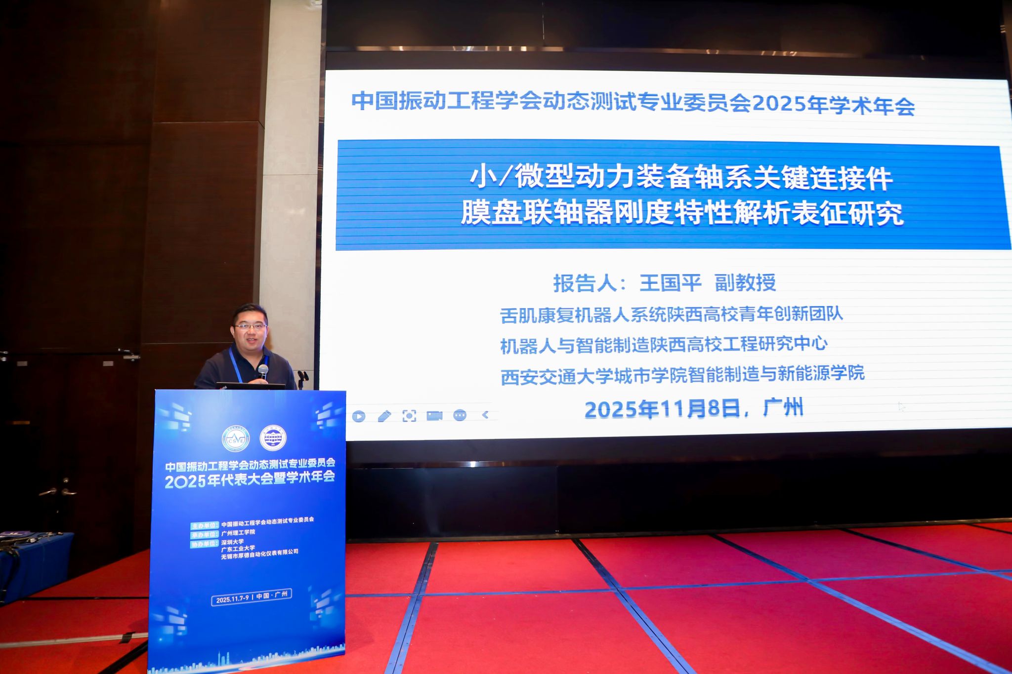 2025年11月7-9日,中国振动工程学会动态测试专业委会2025年度学术年会在广州召开,会议由由中国振动工程学会动态测试专业委员会主办,广州理工学院承办,深圳大学、广东工业大学、无锡市厚德自动化仪表有限公司协办。会议邀请了来自全国90多家高校与科研院所动态测试领域专家学者近300人,讨论交流动态测试方向的发展前沿与工程应用的难点痛点。我校智能制造与新能源学院副院长王国平和机械电子系系主任樊琛参加会议。王国平作题为《小/微型动力装备轴系关键连接件膜盘联轴器刚度特性解析表征研究》的主题报告,受到与会专家学者的好评。