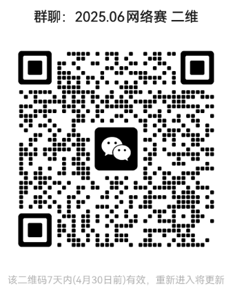 扫描下方二维码加入【2025.06网络赛 二维】,4月30日前修改群昵称为“姓名-班级-学号”(例:张三-机械2101-20212101),选拔流程、赛题说明等均通过微信群发布。